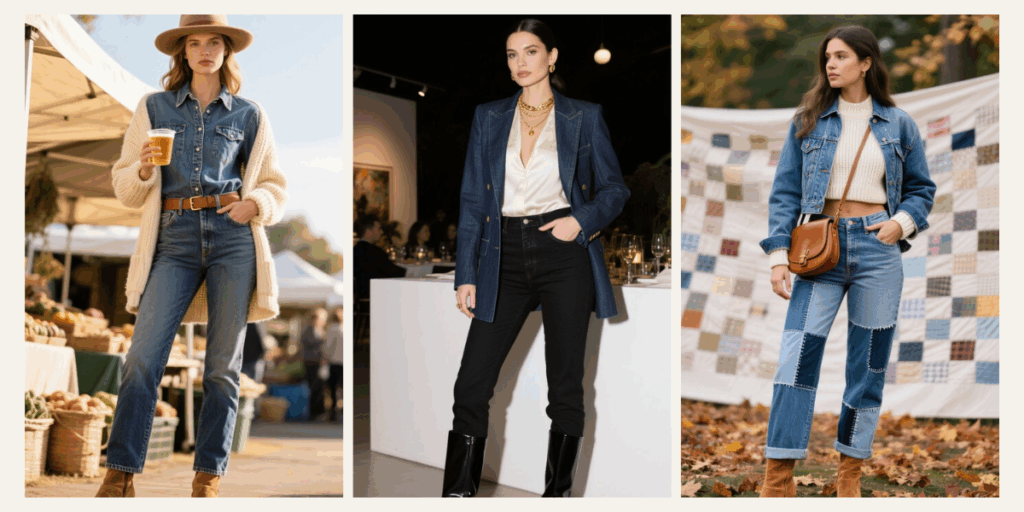 High-waisted jeans with patchwork detailingโ€”different shades of blue stitched togetherโ€”paired with a cropped denim jacket in classic medium wash. Underneath: a cream knit sweater that softens the rugged denim. Add tan suede booties and a crossbody bag in caramel leather. The textures and tones mimic the patchwork quilt of fall leaves on the ground. ๐Ÿ